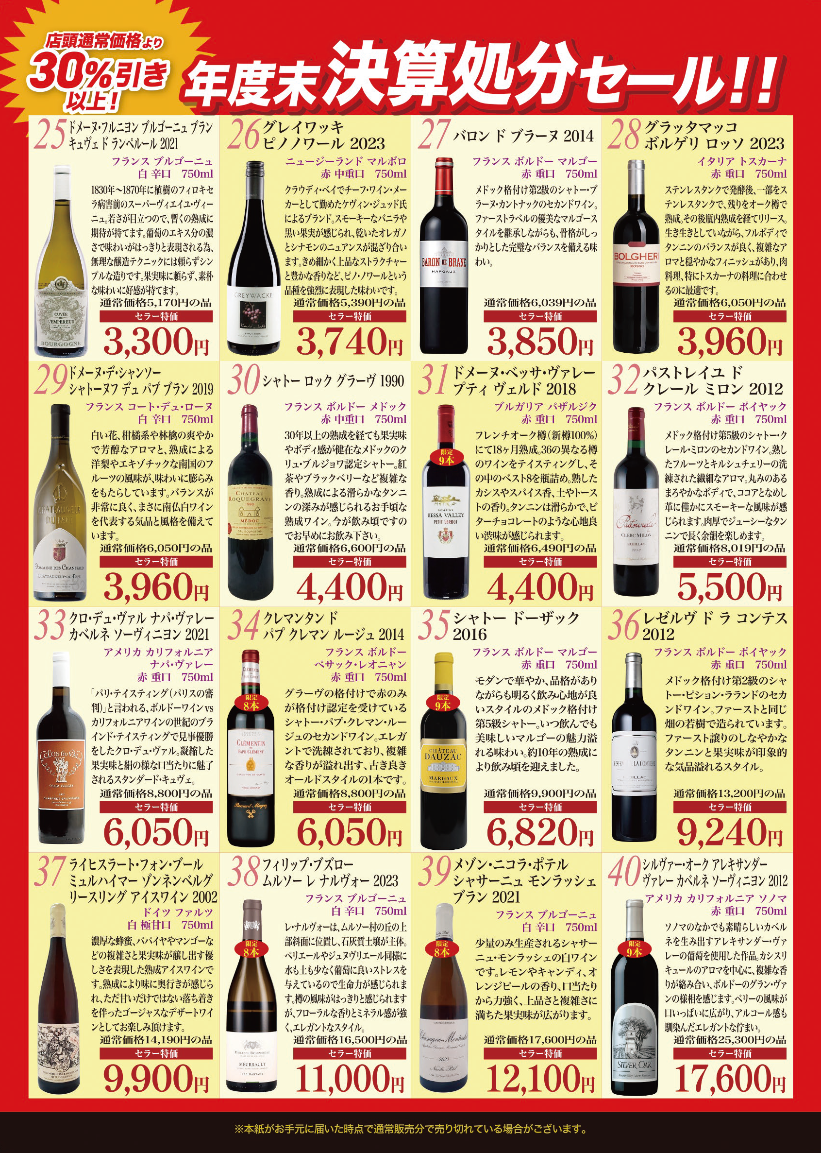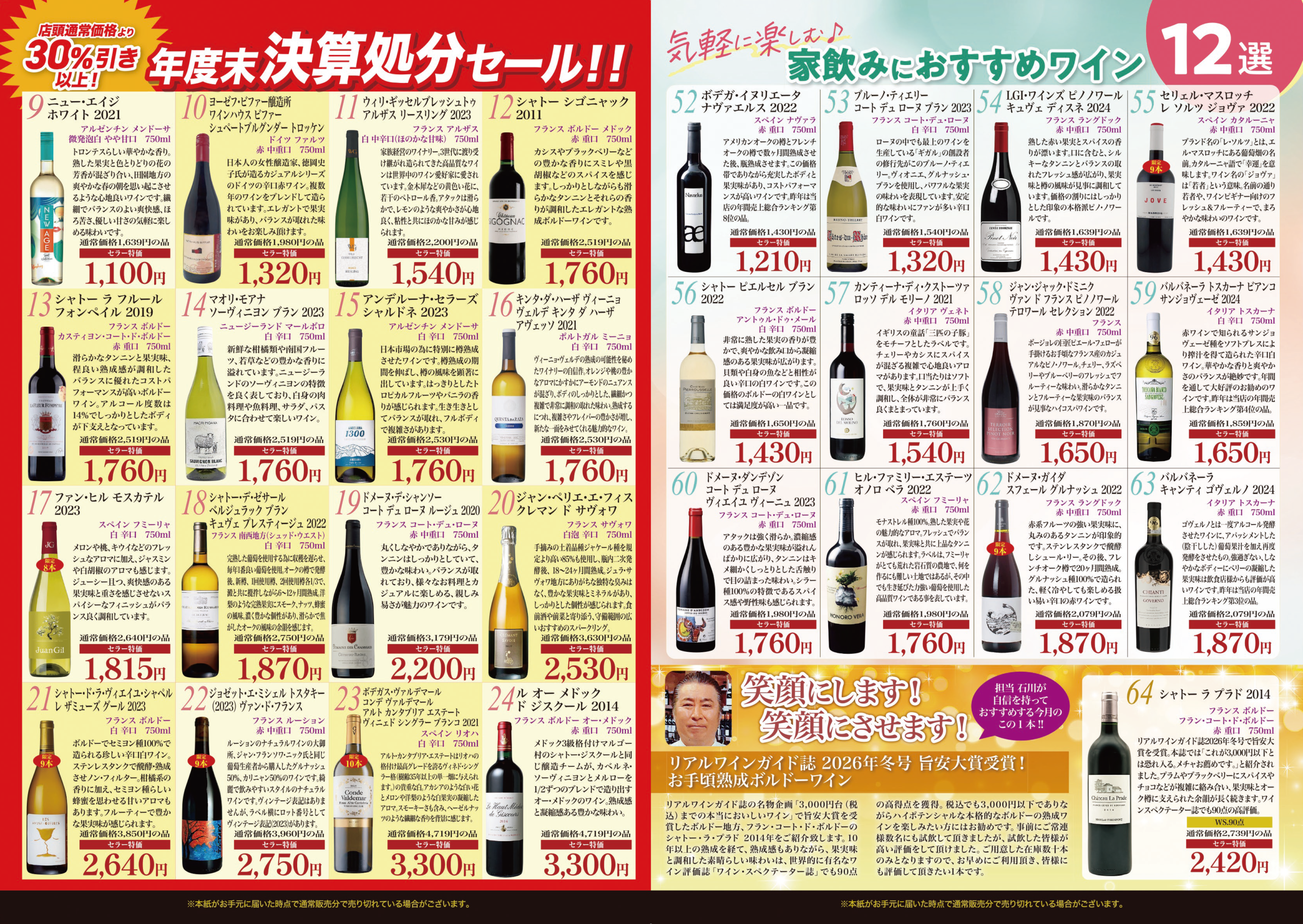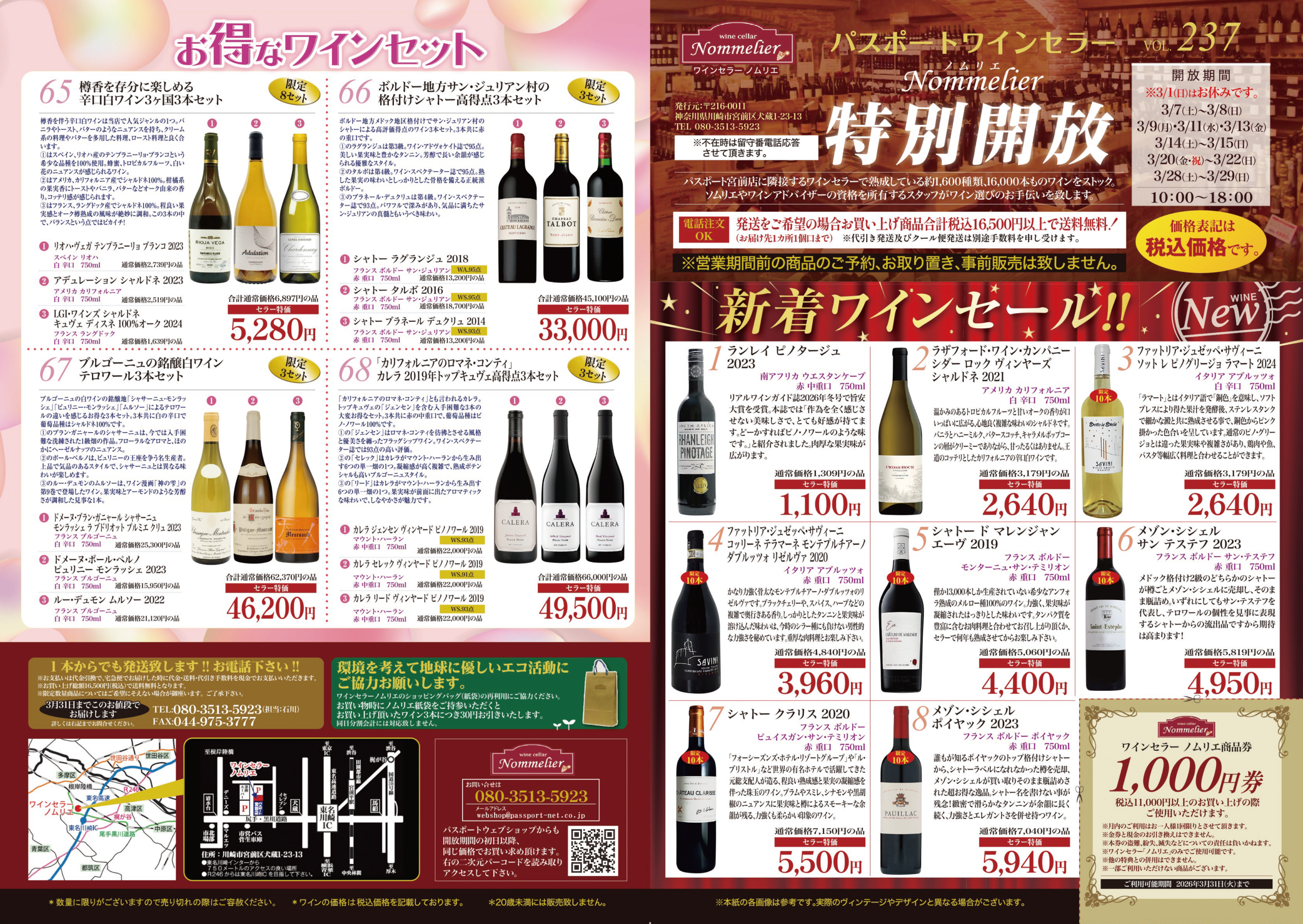 ノムリエ(ワイン館)の2026年3月の開放日とチラシはこちら! 2026.03.01 ノムリエ(ワイン館)のお得な情報満載のチラシと開放日のお知らせです。ぜひご覧ください。 3月のワインセラー開放は、 ※3月1日(日)はお休みです。3月7日(土)、3月8日(日)、3月9日(月)、3月11日(水)、3月13日(金)、3月14日(土)、3月15日(日)、3月20日(金・祝)、3月21日(土)、3月22日(日)、 3月28日(土)、3月29日(日)